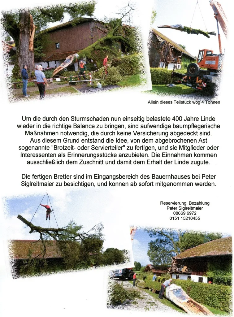 Brotzeit- und Servierbrettl, gefertigt aus dem 400jährigen Holz des abgebrochenen Astes, können Sie bei Herrn Peter Siglreitmeier erwerben. Näheres siehe unten.